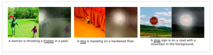 注意也可以用在卷积神经网络和RNN之间的接口上。这允许RNN每步查看图像的不同位置。这种关注的一个流行用途是用于图像字幕。首先,conv网络处理图像,提取高级特征。然后运行RNN,生成图像的描述。由于它在描述中生成每个单词,RNN侧重于conv网对图像相关部分的解释。我们可以明确地想象这个: