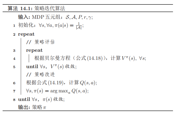 • 策略评估(policy evaluation):计算当前策略下,每个状态的值函数,即算法14.1中的3-6步。策略评估可以通过贝尔曼方程进行迭代计算Vπ(s)。如果状态数有限时,也可以通过直接求解Bellman方程来得到得到Vπ(s)。