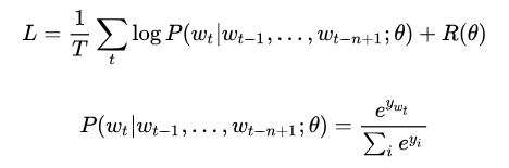 撇去正则化项,NNLM的极大目标函数对数似然函数,其本质上是个N-Gram的语言模型,如下所示