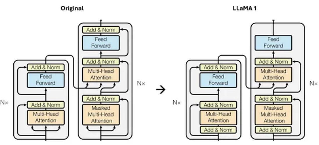 受 GPT3 架构中训练稳定性改进的启发,Llama 1 也对每个 Transformer 子层的输入进行归一化,而不仅仅是对输出进行归一化,如下图所示: