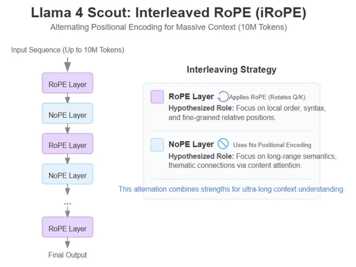 iRoPE 基于经典的 Rotary Position Embeddings (RoPE),但进行了关键优化:
