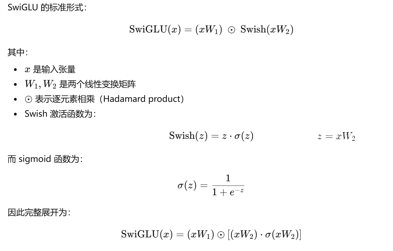 SwiGLU(Swish-Gated Linear Unit)是一种结合非线性激活函数的门控单元激活机制,相比传统的 ReLU 函数,增强了激活函数的表达能力,使模型可以捕捉更复杂的模式。此外,SwiGLU 减少了梯度消失问题(ReLU 容易导致负值被切为0),从而提升训练稳定性和模型性能。