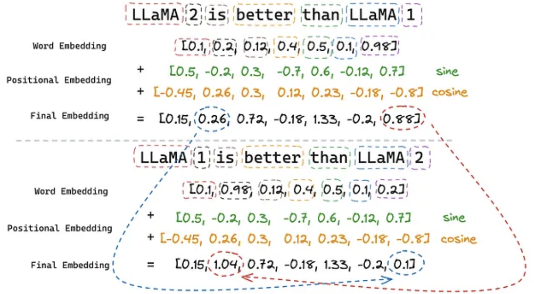 位置嵌入对于语言学习模型(LLM)至关重要,因为Transformer架构具有顺序不变性。这意味着即使两个句子使用了相同的词语,但顺序不同且含义不同,Transformer也会以相同的方式表示它们。例如,如果不应用位置嵌入,以下句子对于Transformer来说含义相同: