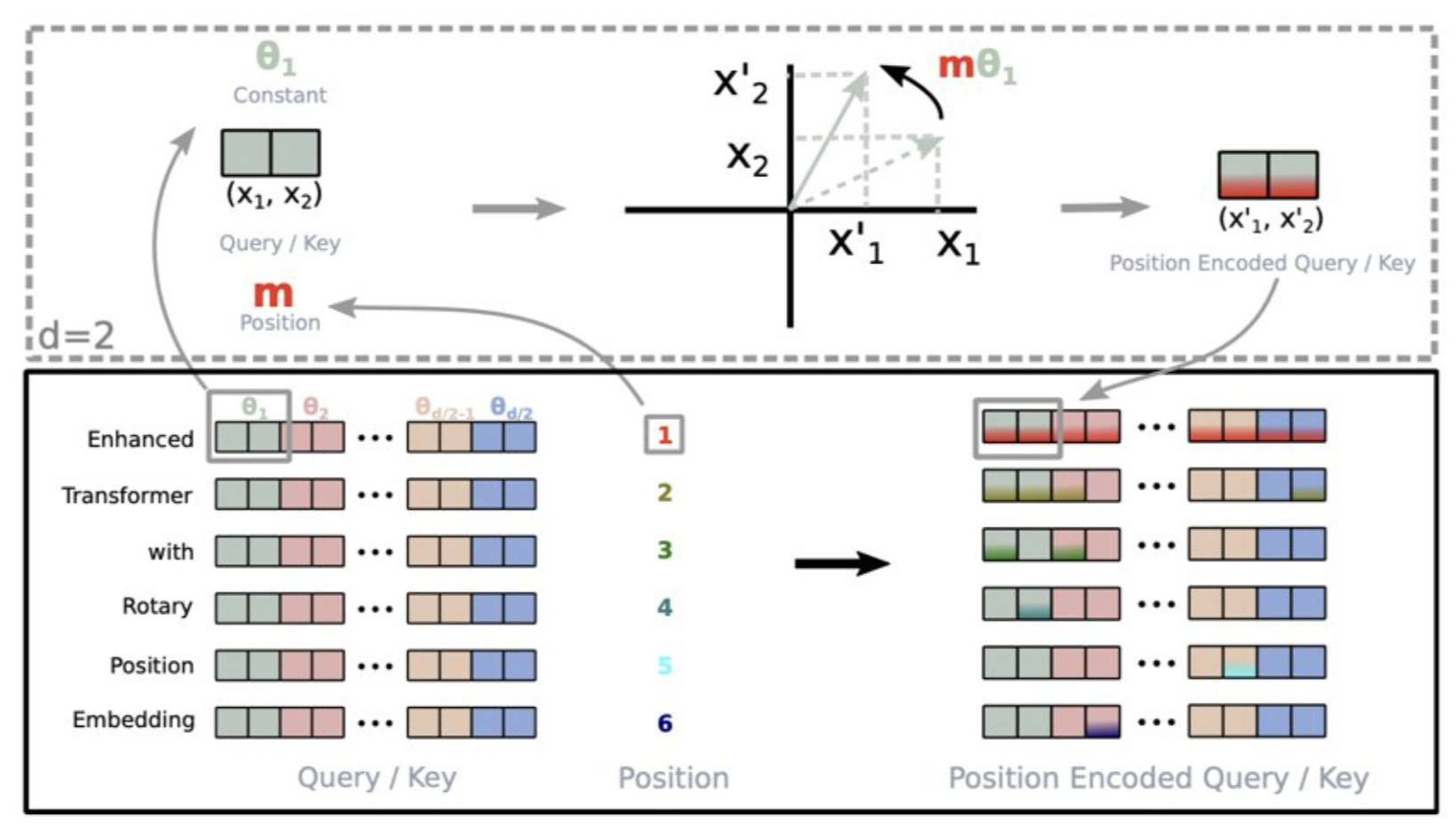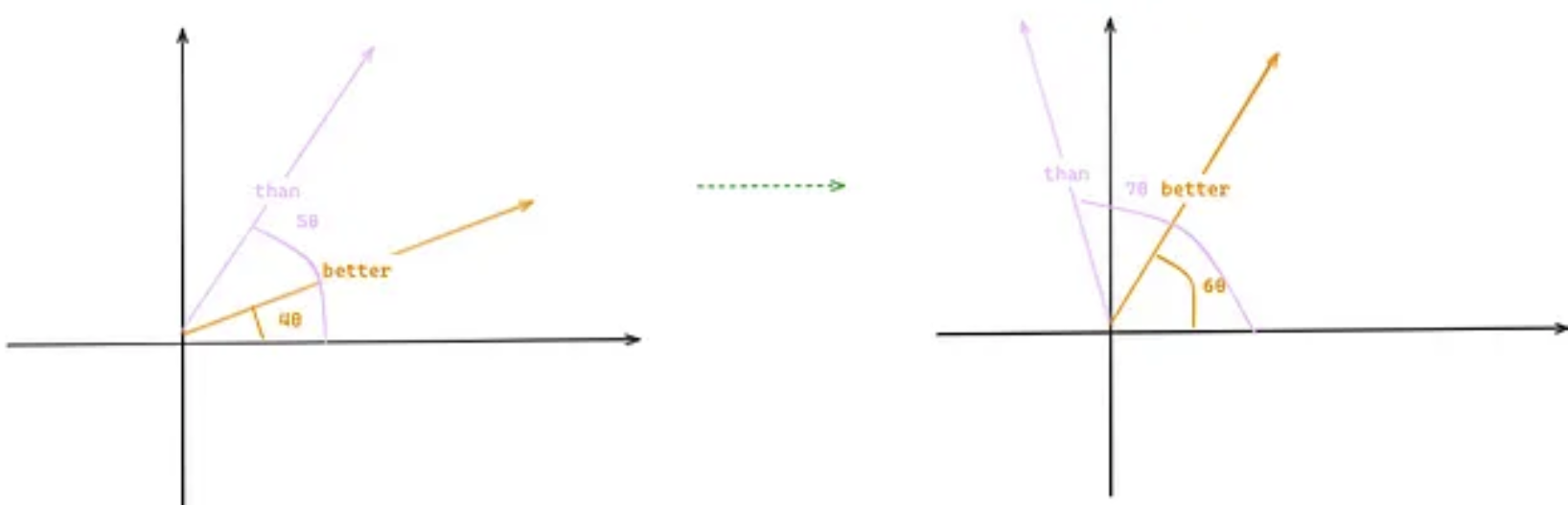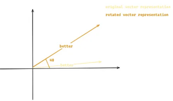 这种方法可以让我们保持词语之间的相对距离,因为即使我们在原句中添加更多词语,两个向量之间的相似度也保持不变。例如,假设我们在句子“Llama 2 is better than Llama 1”中添加两个词,其中“better”和“than”的位置不同(4 和 5 → 6 和 7),但由于旋转角度相同,两个向量之间的相似度也保持不变(左图中向量之间的点积与右图中的点积相同)。