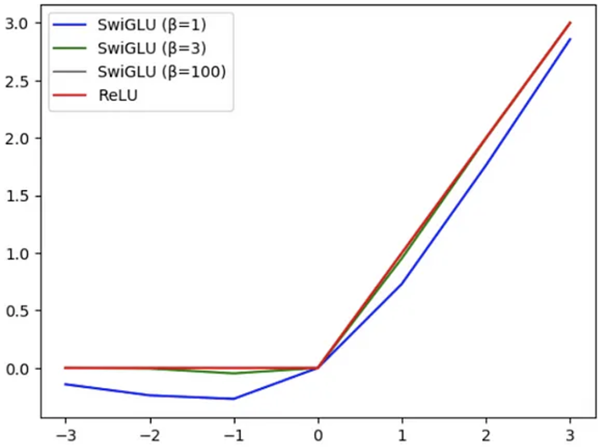 SwiGLU 具有一个可训练参数 β,用于控制插值程度。如图 4 所示,随着 β 值的增加,其行为越来越类似于 ReLU(当 β=100 时,ReLU 和 SwiGLU 重叠)。
