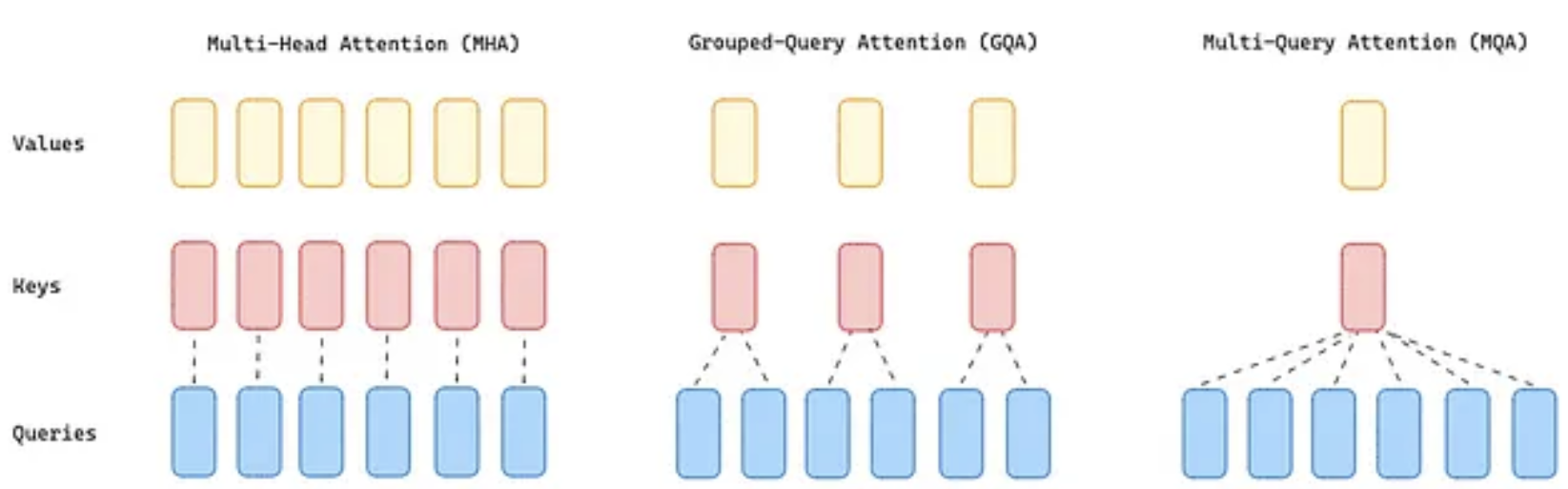 GQA 介于 MHA 和 MQA 之间,它将查询值分成 G 个组(GQA-G),每个组共享一个键值对。GQA-1 表示所有查询都聚合在一个组中,因此与 MQA 相同;而 GQA-H(H = 键值对数量)则等同于 MHA,其中每个查询都被视为一个组。这种方法将键值对的数量减少到每个查询组一个键值对。它减少了缓存的键值对的大小,从而减少了需要加载的数据量。与 MQA 相比,这种更为温和的缩减方式提高了推理速度,并在解码过程中降低了内存需求,同时保持了接近 MHA 的质量和几乎与 MQA 相同的速度。
